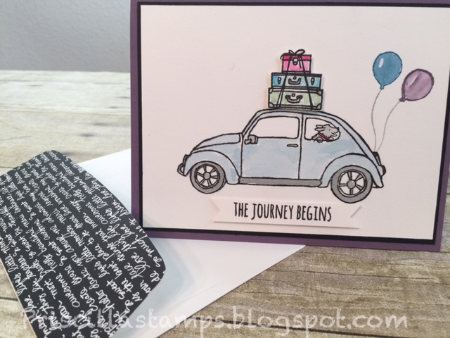 We had such fun hearing about brand new products to be released in January, and we all got a new stamp set, Beautiful Ride. This hit my heart for a number of reasons: (1) my first car was a VW Bug; (2) my son and his family just moved far away and the sentiments in this set are perfect; and (3) it's a BIG set of stamps that can be used for so many occasions!