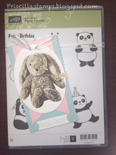 Well, I was about to deliver an order to a customer, who had purchased product for her daughter's (a very talented young stamper) Easter basket. And she earned the Party Pandas Sale-a-Bration stamp set FREE. So I thought maybe her daughter would like a tag for her panda set, and here is what I made: